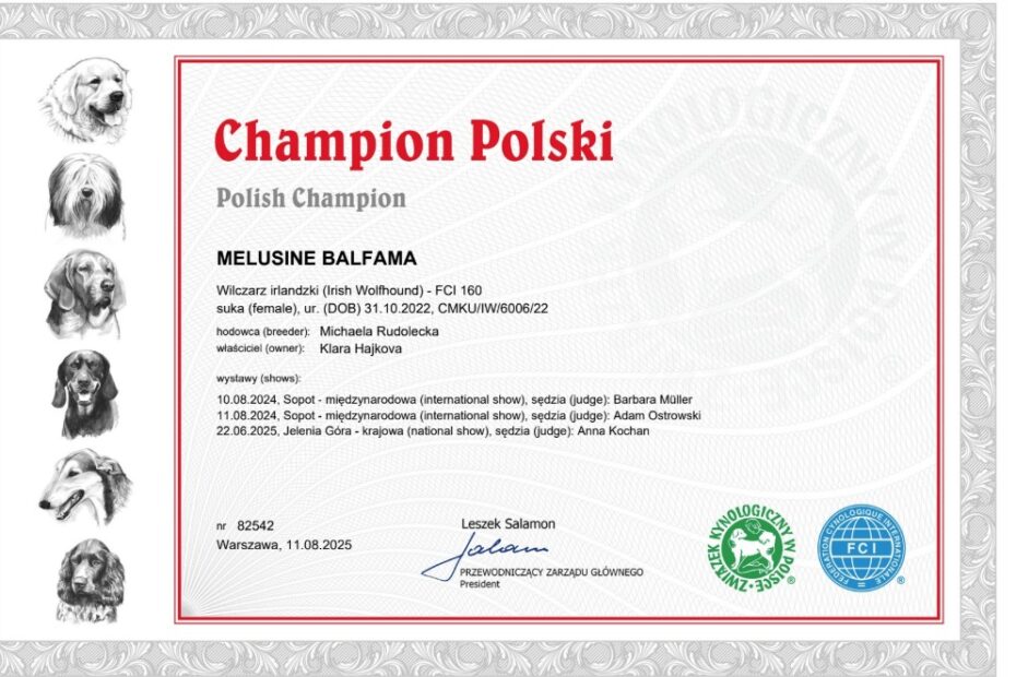 22.6.2025 jsme se vydali s Meluzínkou (Melusine Balfama) na národní výstavu do Polska. Melusine Balfama získala V1, CWC Tímto Melu dodělala titul POLSKÝ ŠAMPION KRÁSY.